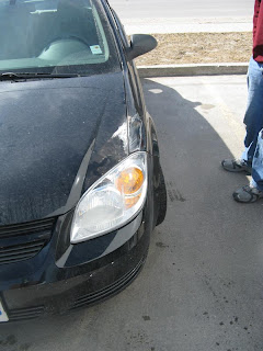 March 26, 2009 -I got my G2 drivers license only last Fall, so my recent trip to North Bay for a client meeting and to help out with Tim Lum’s presentation was a new record journey. Kristi was kinda worried and told me more than once to drive safe and take lots of breaks. It’s nothing short of beautiful irony then that I went ahead and got the car mashed up on the very first break. Luckily I was nowhere near the car at the time. It was the parking lot of a Tim Horton’s Peppermint tea stop when a cube van clipped me. I don’t think the damage is too bad for either vehicle, but still it was a bummer.